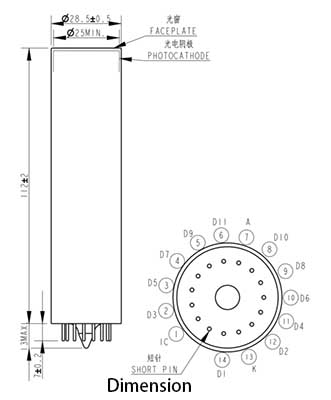 Spectral Range:290-650 nm ; Peak QE:380 nm ; Anode Sensitivity:Min:100 ;Dark Current:30nA