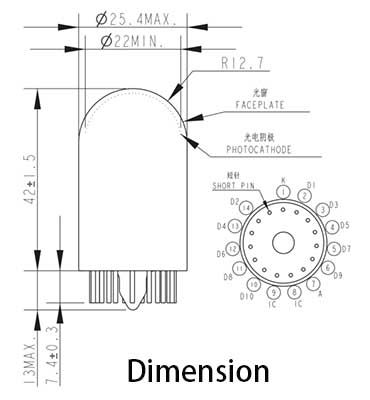 Spectral Range:290-650 nm ; Peak QE:380 nm ;Gain:Typ:5*10^5(@25℃) ; Dark Current:Typ:0.1(@25℃) /Max:10(@25℃)/Max:1000(@175℃)nA