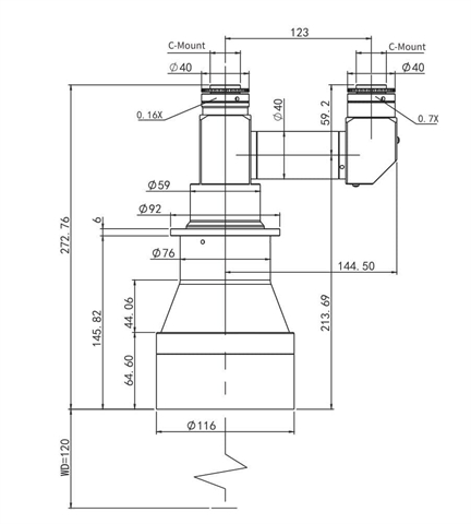 STPMS-LDTC-016/07-120,Double Magnification Bi-Telecentric Lens 0.16X & 0.7X, Max. sensor size 1'',Resolution 25.81/7.63 μm,Working Distance 120 mm