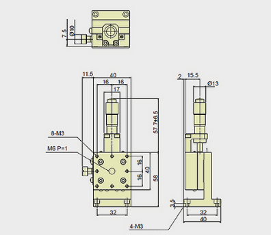 13mm Crossed Roller Guide Z-axis Vertical Stage, Center Drive, Platform dimensions=40x40mm