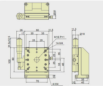 25mm Crossed Roller Guide Z-axis Vertical Stage, Left Side Drive, Platform dimensions=80x80mm