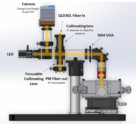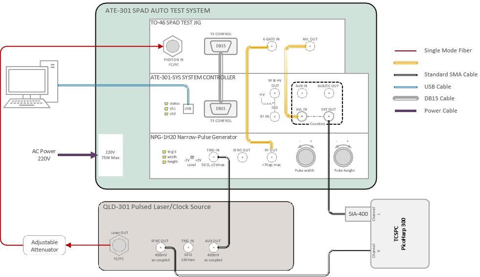 This is composed of a picosecond pulse laser instrument QLD-301, fiber optical setup, Digital delay pulse generator for gate control, Customized fiber Cryo-stage system for 70K cooling, Optical power meter, reference SPD and a set of TCSPC master clock is required.