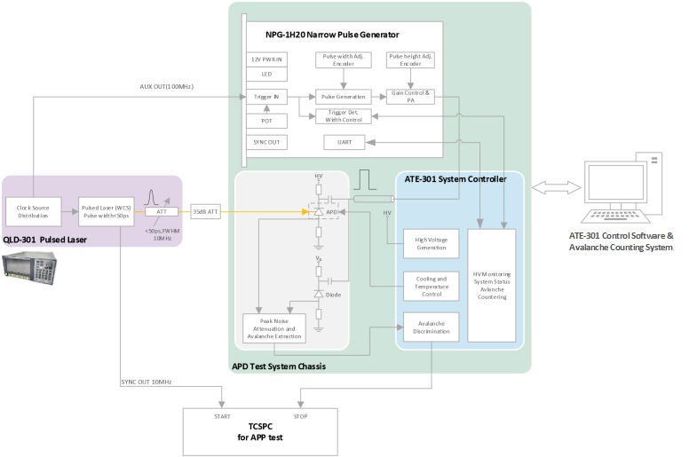 NPG-1H20 can generate a gated pulse signal with adjustable amplitude and pulse width; the ATE-301 part contains APD correlation mode Blocks (high-pressure generation, refrigeration and temperature control, two-channel discrimination counter); the test case includes TO46 refrigeration and signal extraction unit, chassis backplane, etc., of which TO46 refrigeration and signal extraction unit includes: water cooling radiator, thermal insulation structure, TEC Refrigeration unit, spike noise suppression and signal extraction circuit, TO-46 fixture and signal interface, etc. The system composition and principle-block diagram are shown in the following figure: