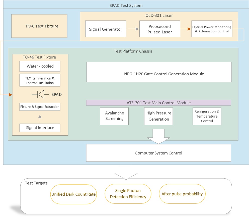 The Packaged SPAD test system is composed of picosecond pulse laser instrument QLD-301, gate control generation module NPG-1H20, test main control module ATE-301 and test chassis (including TO46 water-cooled refrigeration unit). In addition, a set of TCSPC instruments is required. Used to test post-pulse and time jitter. Among them, QLD-301 is a picosecond pulse laser with a built-in signal source, which can generate electrical and optical pulses with adjustable delay (currently an independent instrument, which can be upgraded to a module later as a chassis board);