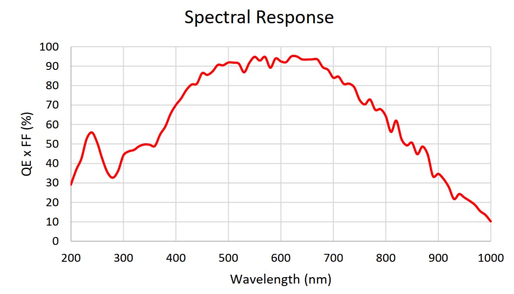 Resolution: 800 (H) x 600 (V) ,Pixel size: 16 um x 16 um ,Sensitive area: 12.8mm x 9.6mm ,Dynamic range: 90 dB ,Data bit depth: 12bit&16bit ,Quantum efficiency: 90.7%@550nm(peak) ,Data interface: USB 3.1 Gen1, Optical interface: C-mount