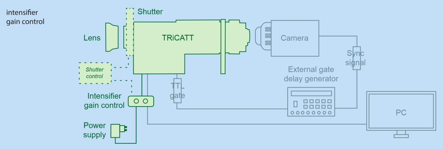 The TRiCATT G can be used as an ultra-fast electro-optical shutter by gating the image intensifier. This eliminates motion blur and reduces the effective exposure time, thereby significantly widening the camera dynamic range. To prevent loss of intrascene dynamic range when using a shorter gate the user can set a higher MCP gain. The pulse width and frequency are user defined: any pulse width from DC down to a few nanoseconds can be applied.