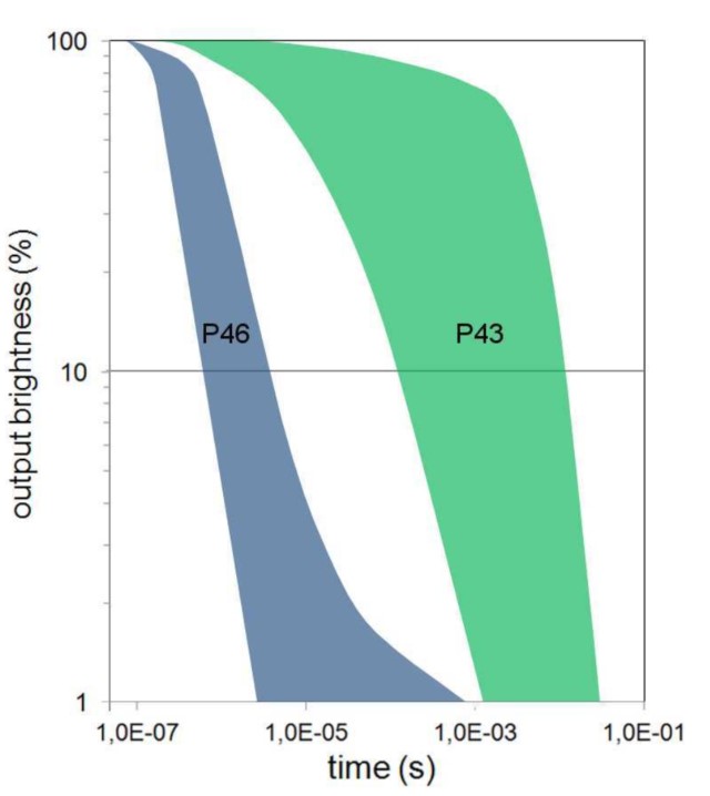Our high-speed cameras and camera attachments use P46 phosphor. This phosphor has a short decay time, so the light signal of consecutive frames doesn't get mixed up.