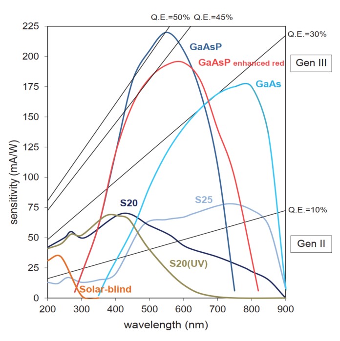 The photocathode is the entrance of the image intensifier. This is where the incoming photons are converted to electrons. The quantum efficiency of the photocathode material specifies how efficient this conversion is for each wavelength.