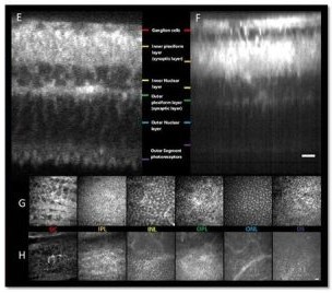 In the image acquired with the system we clearly distinguish the synaptic (bright regions) and nuclear (gap regions) layers that characterize the tissue. It is interesting to mention that the rat retina is highly autofluorescent when illuminated with light in the blue-green spectrum.
