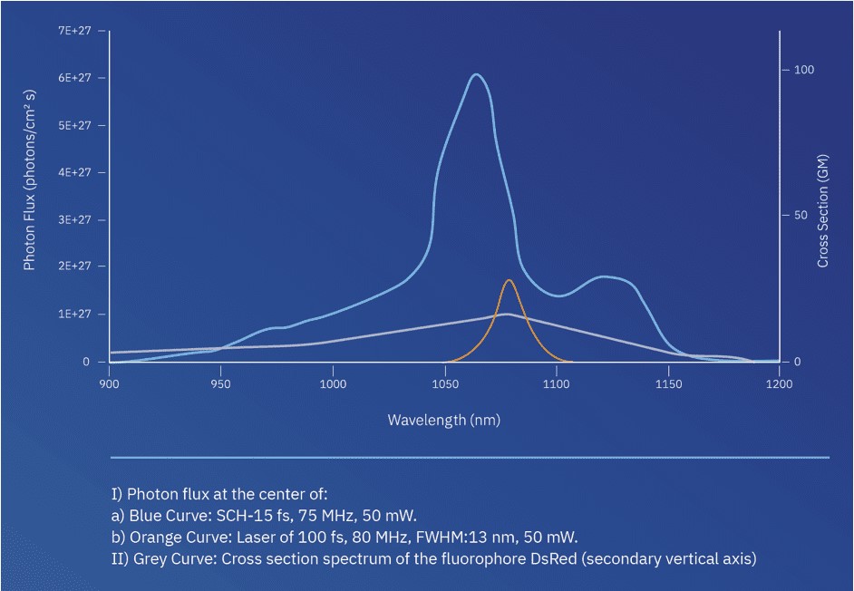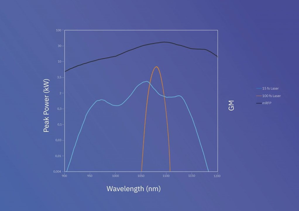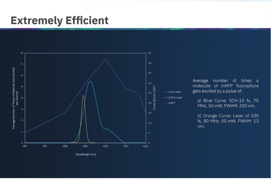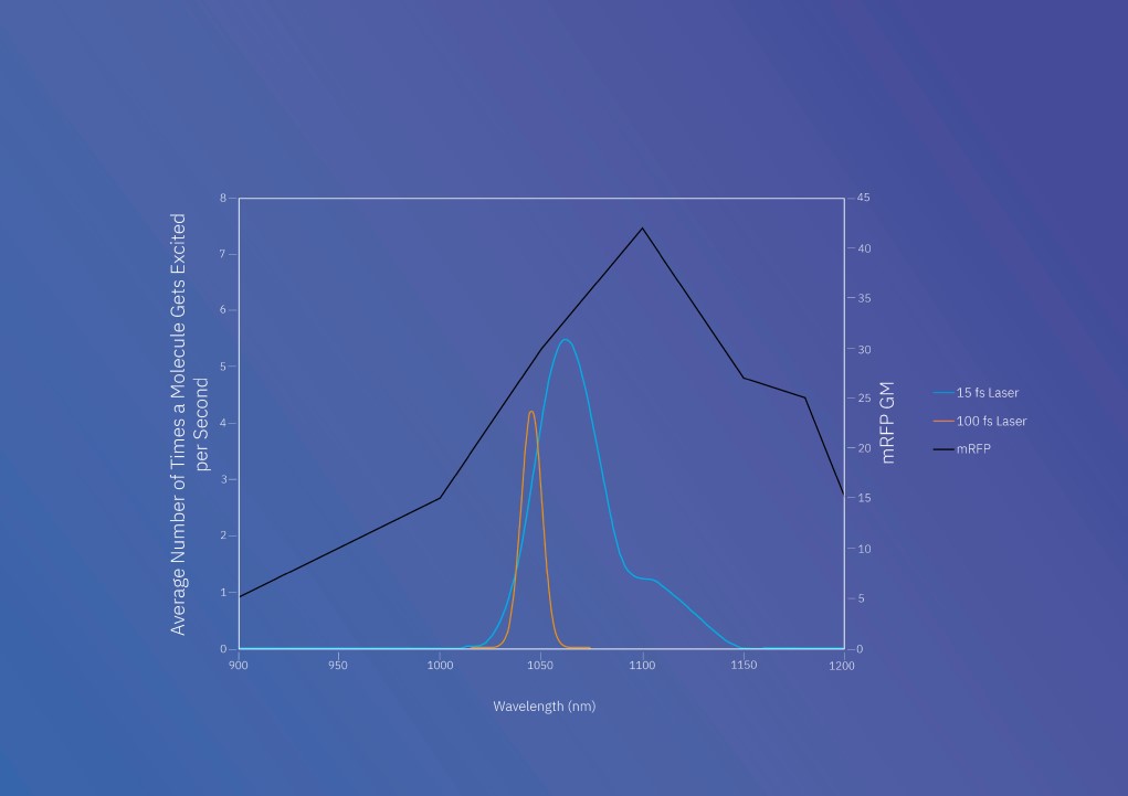 Considering the peak power and the excitation cross-section at each wavelength, the excitation efficiency of mRFP can be calculated. The result is that a 50% improvement in efficiency is obtained with a 15fs laser such as the cyclone compared to the traditional 100fs lasers.