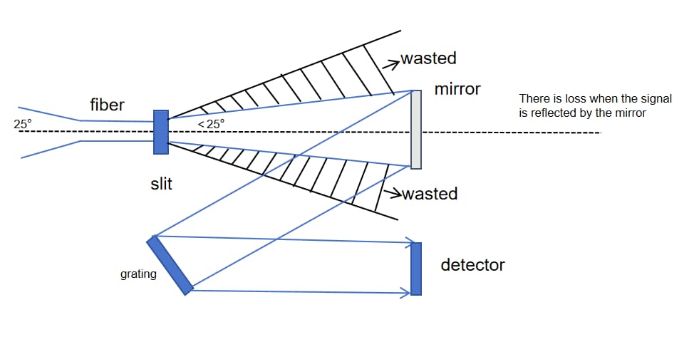 For the traditional C-T type optical path spectrometer, its optical path usually includes multiple mirrors and dispersion elements,due to the existence of multiple reflections in the optical path, the loss of the optical signal during propagation is relatively high.The Ultra series spectrometer overcomes the disadvantages of the C-T type optical path through the design of a transmission optical path and a large numerical aperture.
