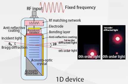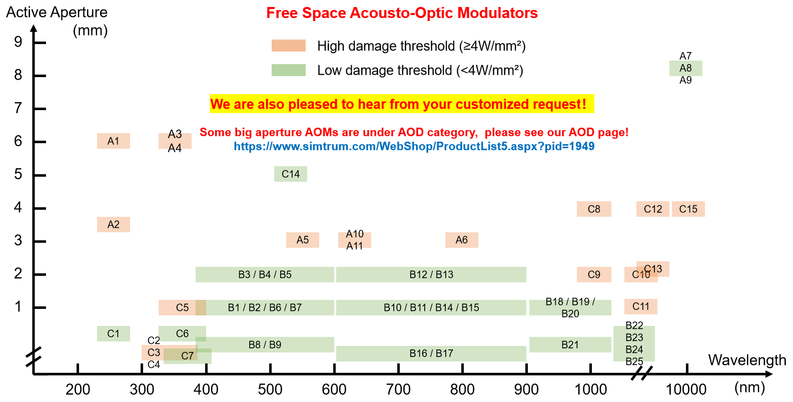 Free-space Acousto-Optic Modulators (AOM), Wavelength 310-400 nm, Active Aperture 0.15 mm, Center Frequency 220 MHz, 3dB Bandwidth 50MHz, Diffraction Efficiency >60%, Transmission >95%, Conduction Cooling, Optional RF driver, 20 Channels