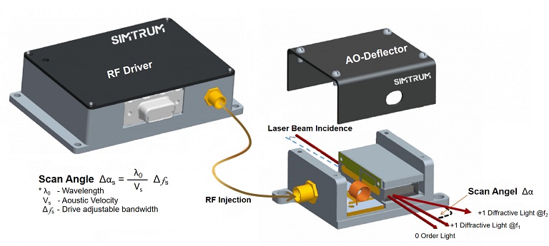 Wavelength 780nm, Clear Aperture 2mm, Center Frequency 80MHz, 3dB Bandwidth 40MHz, Scan Angle 7.4mrad, Diffraction Efficiency >80%, Tellurium Dioxide, Conduction Cooling, Optional RF Driver