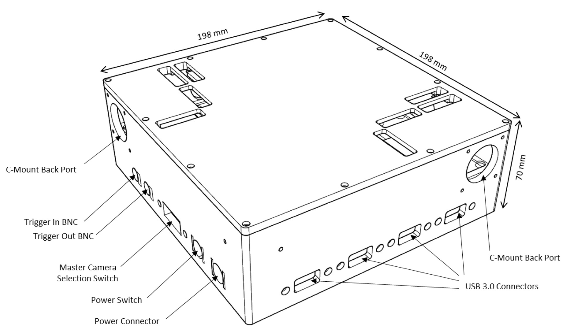 Tripod mounting4 x ¼-20 and 4 x M6 threaded holes on bottom near center