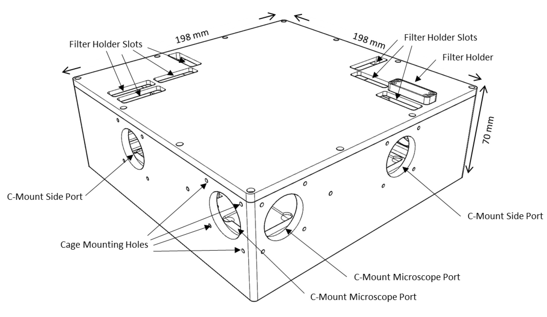 External output portsTwo C-Mount ports on each arm. Each port with 4-40 screw holes for 30 mm cage optics.