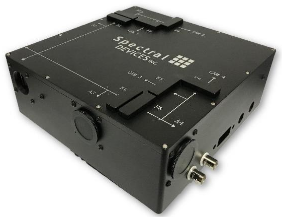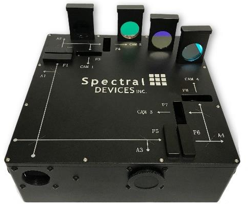 The multisperctral camera system splits light from a single c-mount entrance port into 4 channels for simultaneous imaging. Eight (8) removable standard 1-inch filter holders are inserted at locations within the 4 beams. Use any camera as an internal trigger source or connect all four cameras to an external trigger source. Synchronize external devices using the sync signal. All cameras have global shutter to provide accurate high-speed images of moving objects in the field of view. USB3 Vision and GenICam-compliance makes system setup and use easy. The systems are expandable with up to 4 external c-mount cameras or detectors.