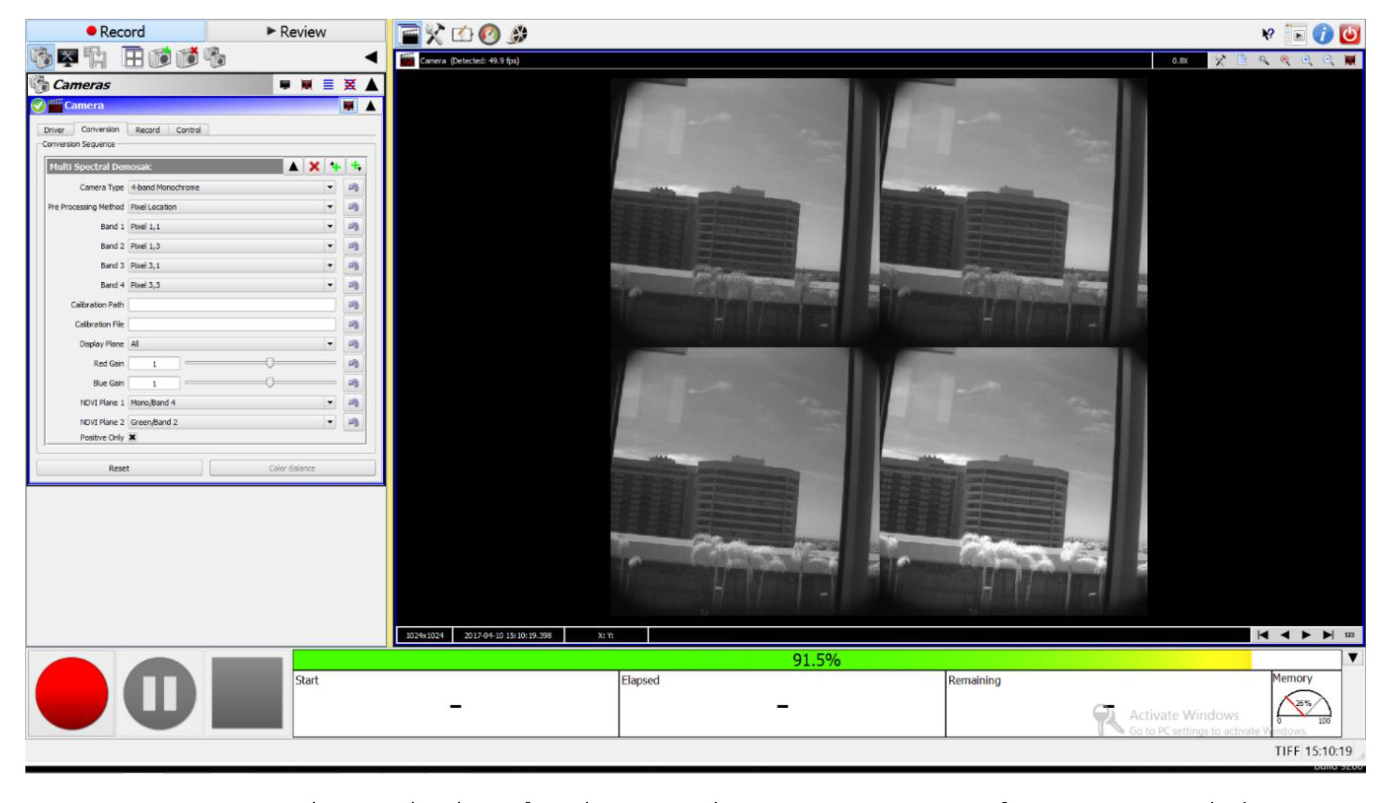 Real-time display of multispectral images in montage format. Example here collected with 4-band multispectral camera for agriculture