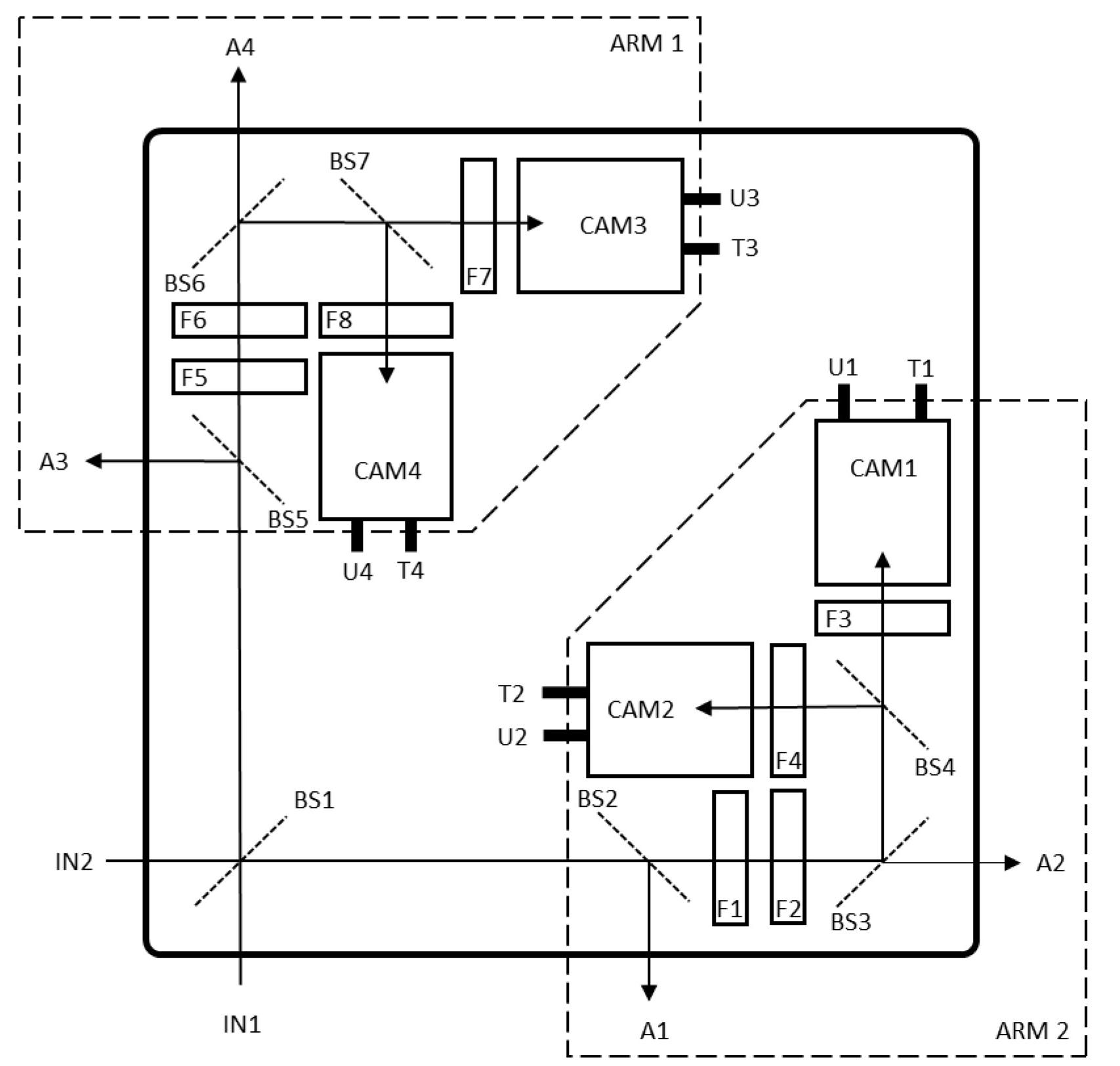 Drawing shows a schematic of the internals of the multispectral cameral microscopy system.The drawing illustrates the layout of the cameras (CAM*) with respect to the beam splitters (BS*) and filters (F*). Each camera has a USB3 data connection (U*) and a trigger input/output (T*). One camera can act as a master and trigger the others. Alternatively, the four cameras can be triggered with an external signal through a BNC connection on the side of the unit. The trigger signal is available as a signal output on a BNC connector on the side of the unit.