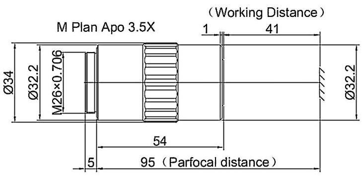 Plan Apochromatic Objective(VIS) 3.5X, Numerical Aperture 0.1, Working Distance 41MM, Focal Length 57.14MM, Resolution 2.8um, Depth of Focus 28um