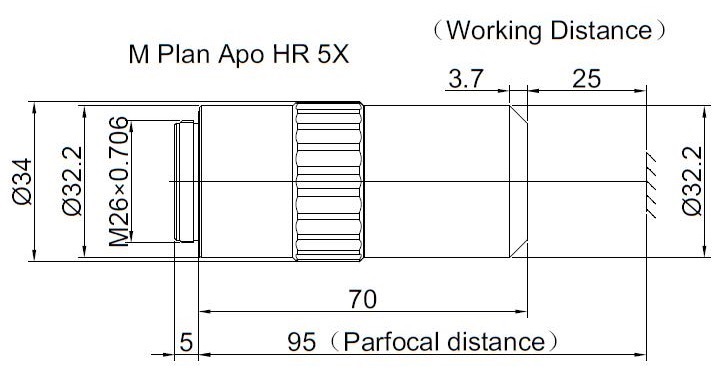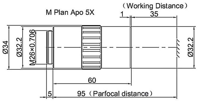 Plan Apochromatic Objective(VIS) 5X, Numerical Aperture 0.14, Working Distance 35MM, Focal Length 40MM, Resolution 2um, Depth of Focus 14um