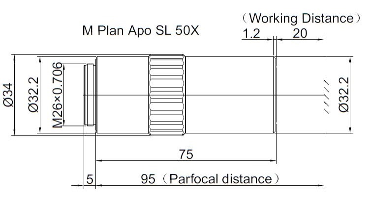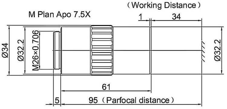Plan Apochromatic Objective(VIS) 7.5X, Numerical Aperture 0.21, Working Distance 34MM, Focal Length 26.67MM, Resolution 1.3um, Depth of Focus 6.2um