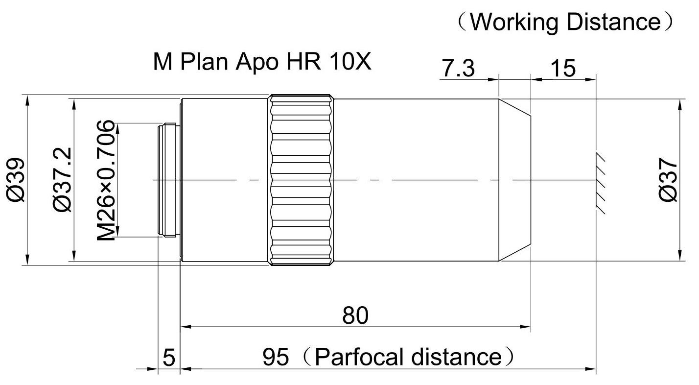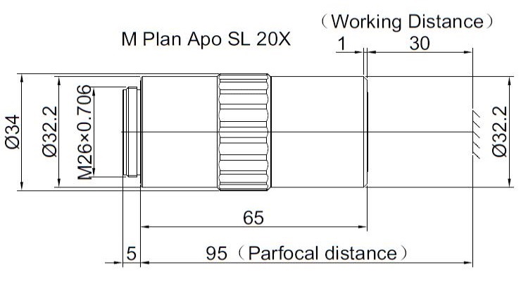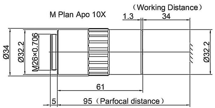 Plan Apochromatic Objective(VIS) 10X, Numerical Aperture 0.28, Working Distance 34MM, Focal Length 20MM, Resolution 1um, Depth of Focus 3.5um