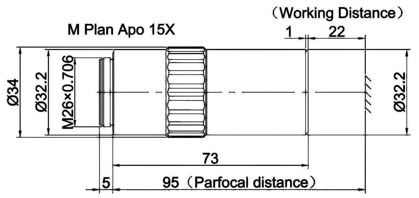 Plan Apochromatic Objective(VIS) 15X, Numerical Aperture 0.35, Working Distance 22MM, Focal Length 13.33MM, Resolution 0.8um, Depth of Focus 2.2um