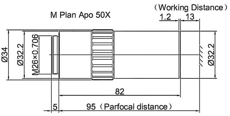 Plan Apochromatic Objective(VIS) 50X, Numerical Aperture 0.55, Working Distance 13MM, Focal Length 4MM, Resolution 0.5um, Depth of Focus 0.9um