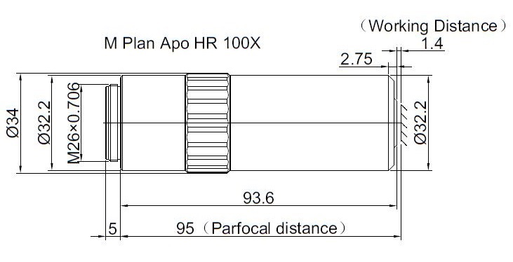 Plan Apohromatic Objective High Resolution(VIS) 100X, Numerical Aperture 0.9, Working Distance 1.4MM, Focal Length 2MM, Resolution 0.3um, Depth of Focus 0.34um