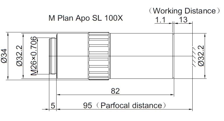 Plan Apochromatic Objective Super Long Working Distance (VIS) 100X, Numerical Aperture 0.55, Working Distance 13MM, Focal Length 2MM, Resolution 0.5um, Depth of Focus 0.9um