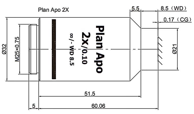 Plan Apochromatic Objective 2X, Optical System Characteristics Infinite Correction, Observation Method Bright Filed / Fluorescence, Level of Chromatic Aberration Correction Apochromatism, Focal Length 100MM, Field Number of The Objective 25MM, Numerical Aperture 0.1, Working Distance 8.5MM