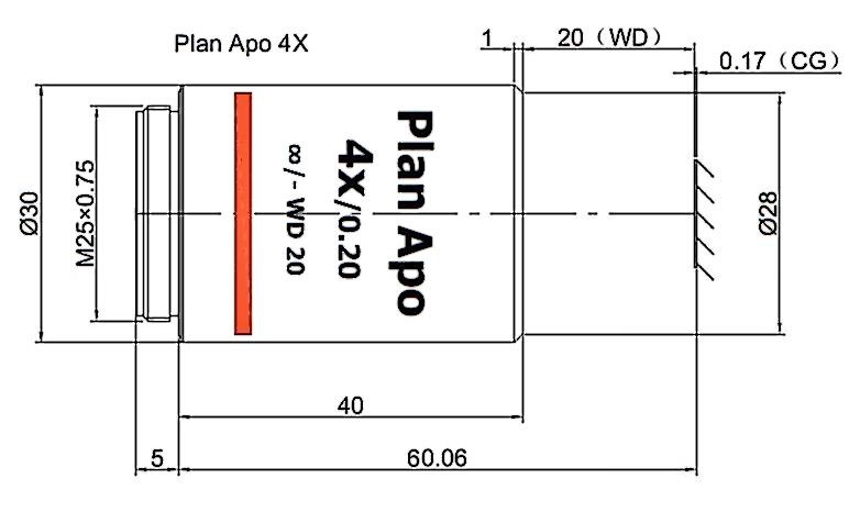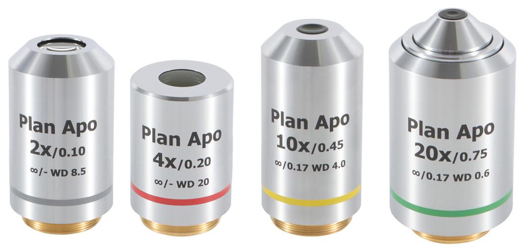 Plan Apochromatic Objective 4X, Optical System Characteristics Infinite Correction, Observation Method Bright Filed / Fluorescence, Level of Chromatic Aberration Correction Apochromatism, Focal Length 50MM, Field Number of The Objective 25MM, Numerical Aperture 0.2, Working Distance 20MM