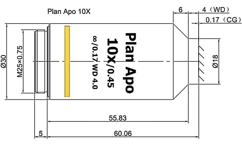 Plan Apochromatic Objective 10X, Optical System Characteristics Infinite Correction, Observation Method Bright Filed / Fluorescence, Level of Chromatic Aberration Correction Apochromatism, Focal Length 20MM, Field Number of The Objective 25MM, Numerical Aperture 0.45, Working Distance 4MM, Cover Glass Thickness 0.17MM