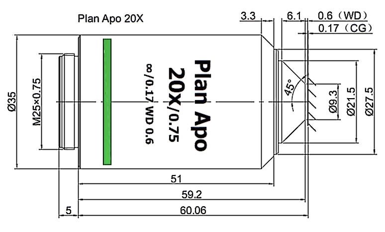 Plan Apochromatic Objective 20X, Optical System Characteristics Infinite Correction, Observation Method Bright Filed / Fluorescence, Level of Chromatic Aberration Correction Apochromatism, Focal Length 10MM, Field Number of The Objective 25MM, Numerical Aperture 0.75, Working Distance 0.6MM, Cover Glass Thickness 0.17MM