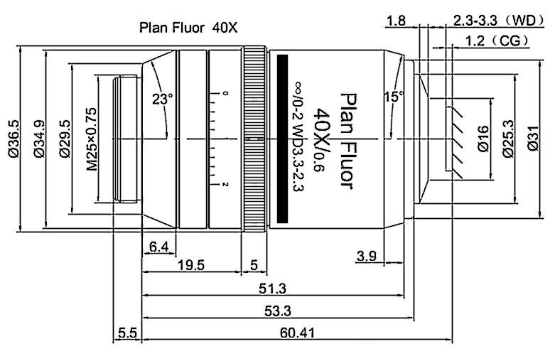 Plan Fluorite Objective 60X, Optical System Characteristics Infinite Correction, Observation Method Bright Filed / Fluorescence, Level of Chromatic Aberration Correction Semi-apochromatism, Focal Length 3.3MM, Numerical Aperture 0.7, Working Distance1.6-2.3MM, Cover Glass Thickness 0-2MM