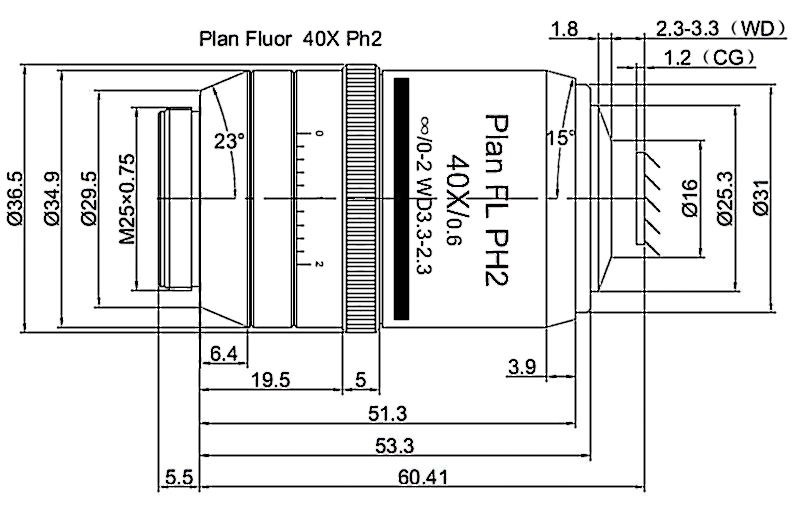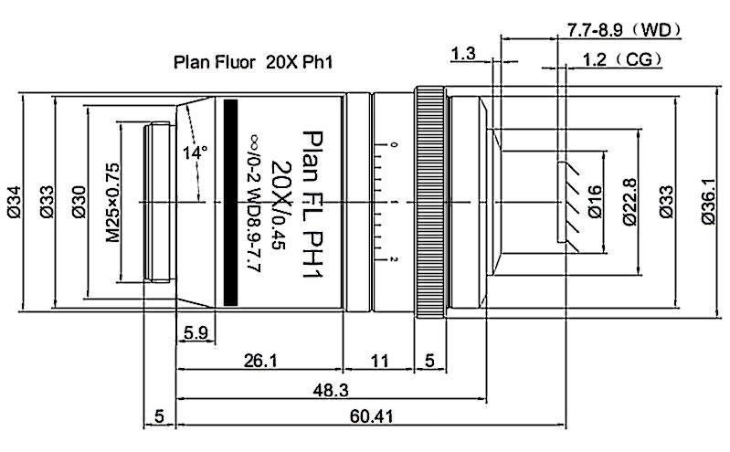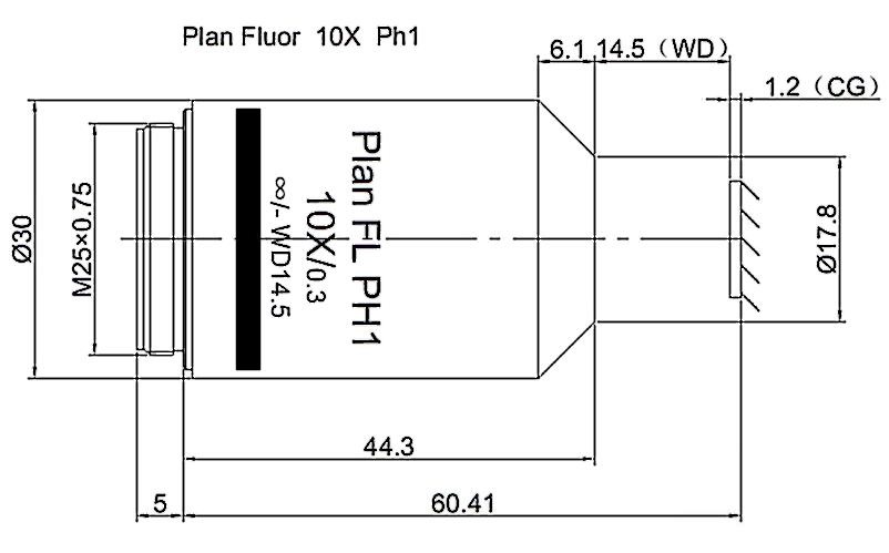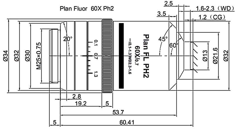 Plan Fluorite Objective Phase-contrast 60X, Optical System Characteristics Infinite Correction, Observation Method Bright Field / Dark Field / Fluorescence, Level of Chromatic Aberration Correction Semi-apochromatism, Focal Length 3.3MM, Numerical Aperture 0.7, Working Distance 1.6-2.3MM, Cover Glass Thickness 0-2JMM