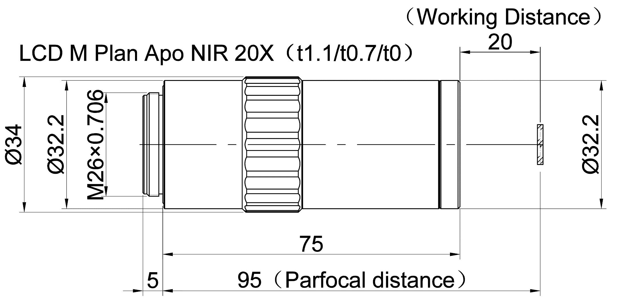 Liquid Crystal Display Plan Apochromatic Objective NIR 20X (t0.7), Numerical Aperture 0.4, Working Distance 20MM, Focal Length 10MM, Resolution 0.7um, Depth of Focus 1.7um