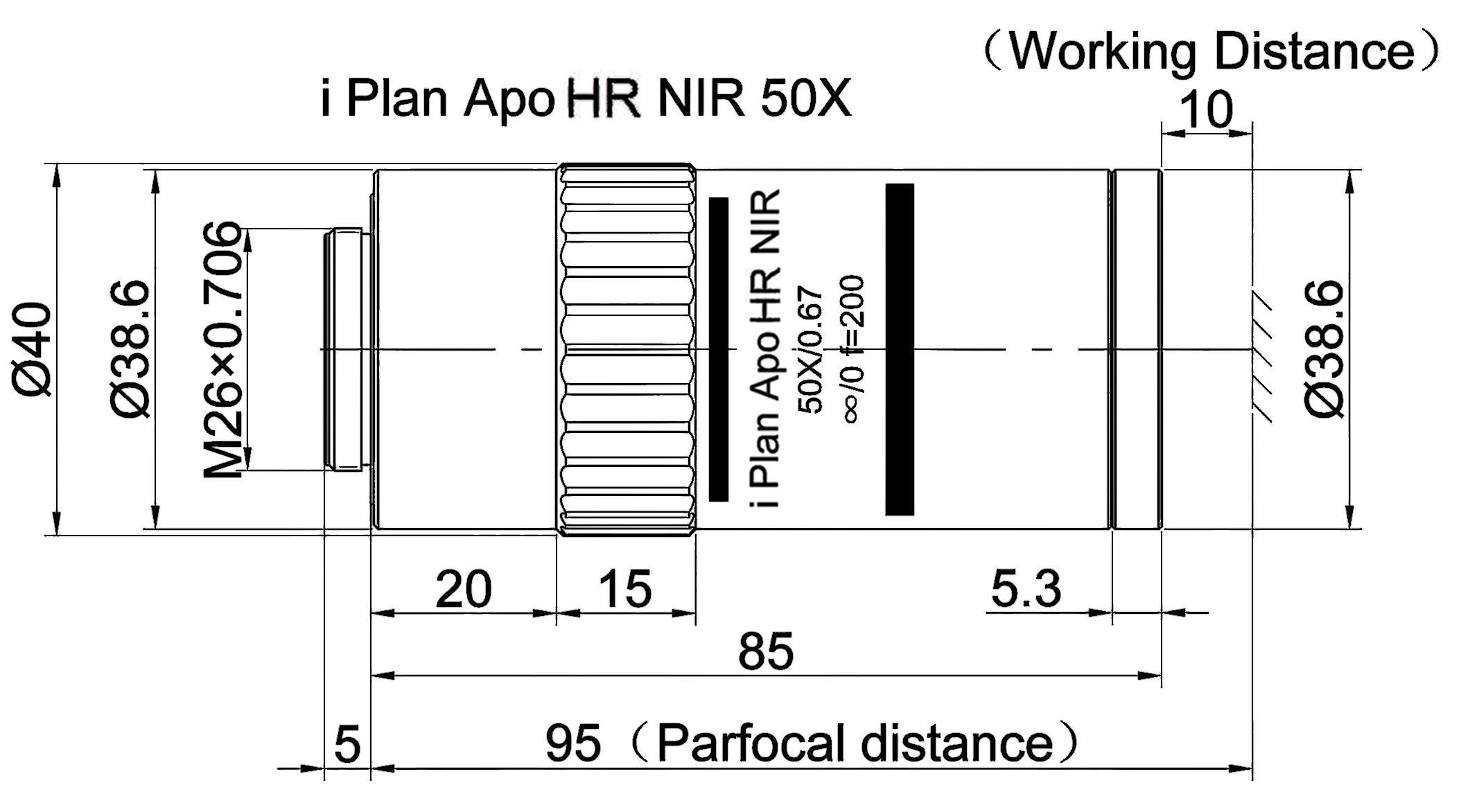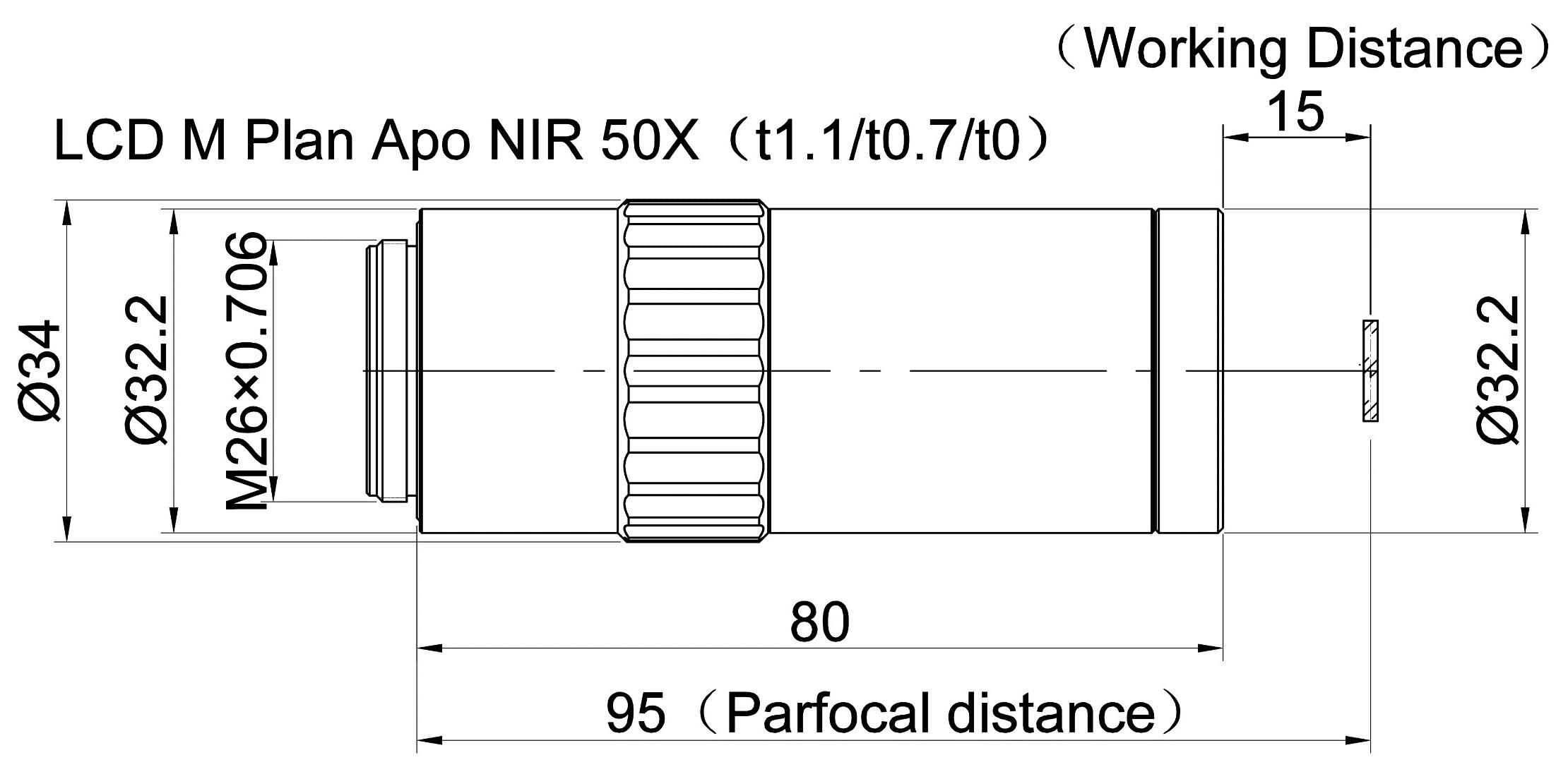 Liquid Crystal Display Plan Apochromatic Objective NIR 50X (t0), Numerical Aperture 0.45, Working Distance 15MM, Focal Length 4MM, Resolution 0.6um, Depth of Focus 1.4um