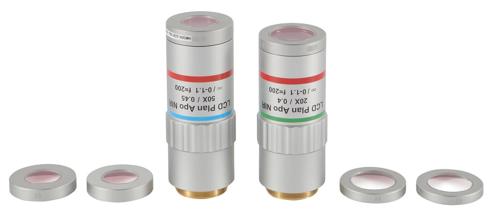 Liquid Crystal Display Plan Apochromatic Objective NIR 50X (t1.1), Numerical Aperture 0.45, Working Distance 15MM, Focal Length 4MM, Resolutio =0.6um, Depth of Focus 1.4um