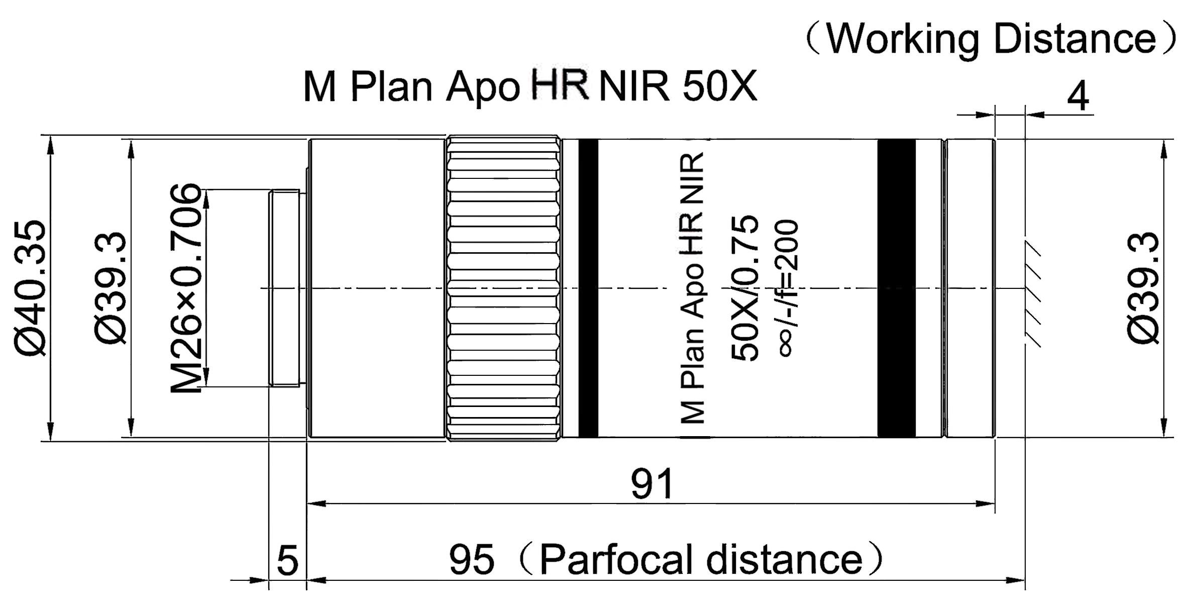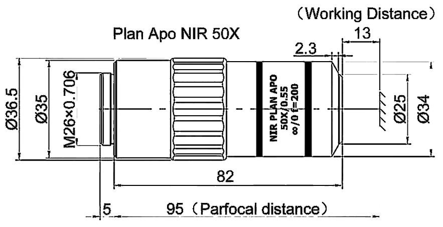 Plan Apochromatic Objective NIR 50X, Numerical Aperture 0.55, Working Distance 13MM, Focal Length 4MM, Resolution 0.5um, Depth of Focus 0.91um