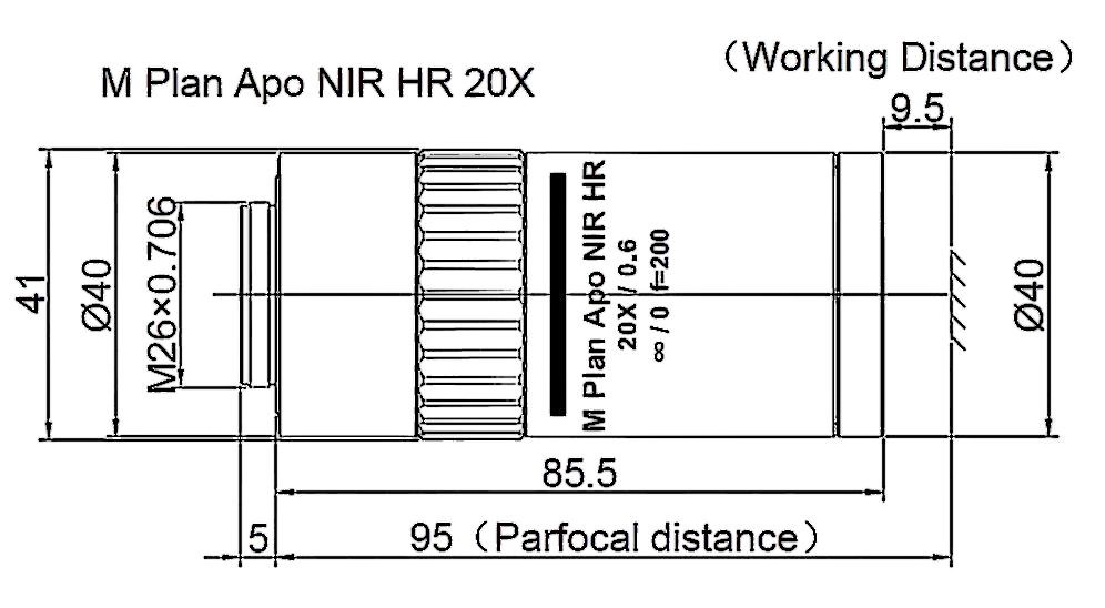Plan Apochromatic Objective NIR 20X, Numerical Aperture 0.42, Working Distance 20MM, Focal Length 10MM, Resolution 0.65um, Depth of Focus 1.56um