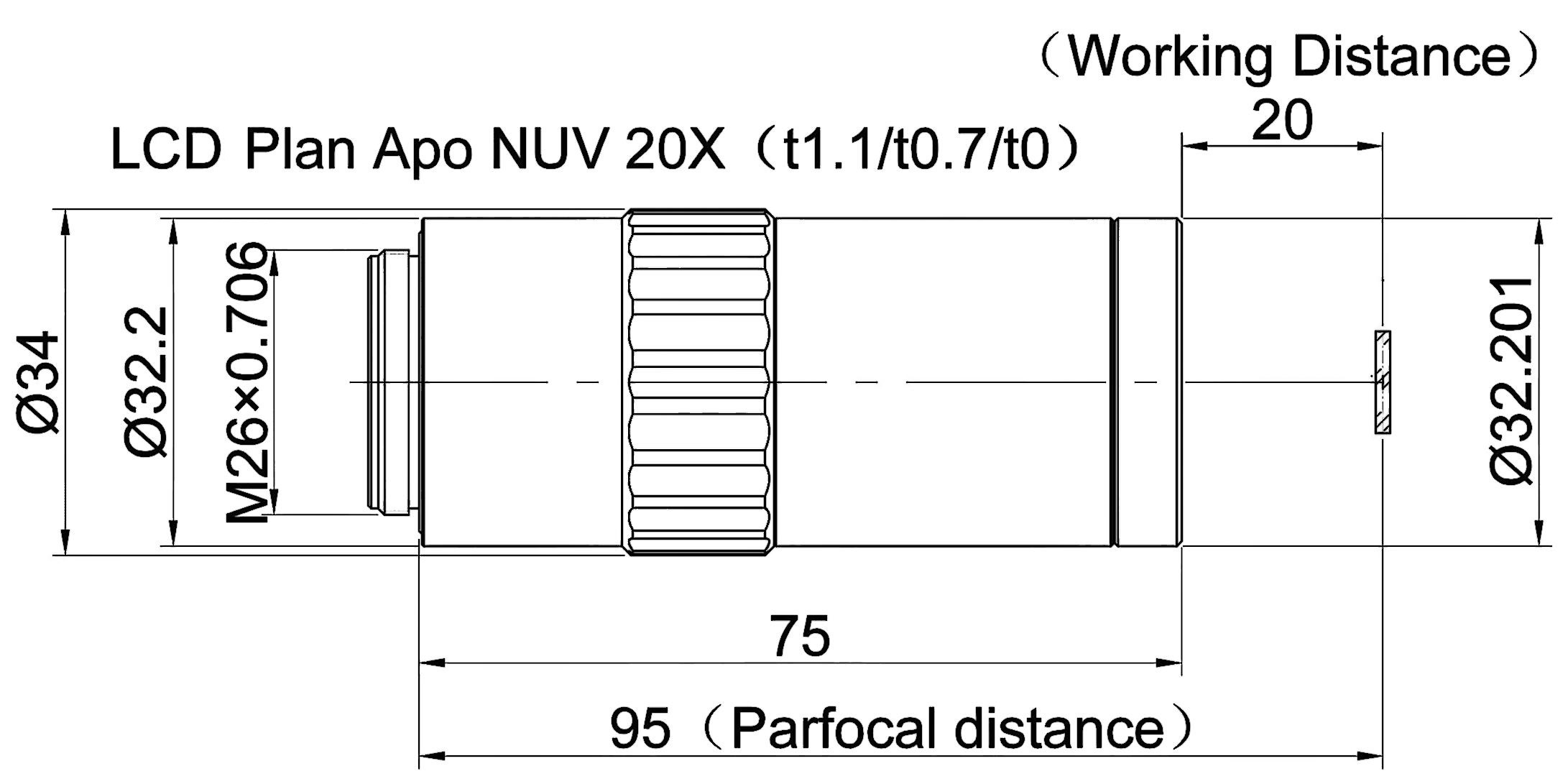 Liquid Crystal Display Plan Apochromatic Objective NUV 20X (t1.1), Numerical Aperture 0.4, Working Distance 20MM, Focal Length 10MM, Resolution 0.7um, Depth of Focus 1.7um