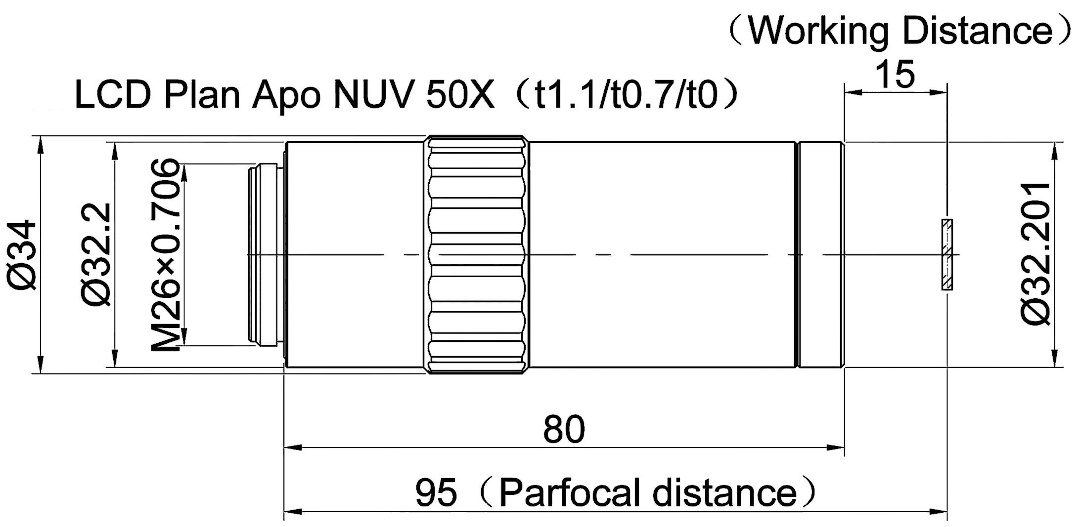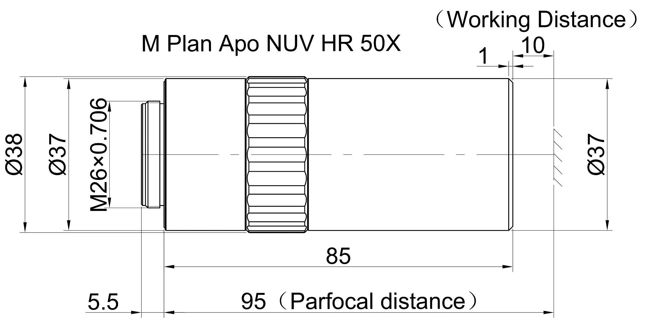 Liquid Crystal Display Plan Apochromatic Objective NUV 50X (t0.7), Numerical Aperture 0.45, Working Distance 15MM, Focal Length 4MM, Resolution 0.6um, Depth of Focus 1.4um