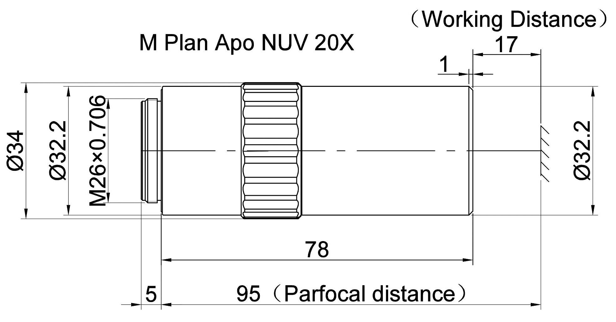 Plan Apochromatic Objective NUV 20X, Numerical Aperture 0.42, Working Distance 17MM, Focal Length 10MM, Resolution 0.65um, Depth of Focus 1.56um