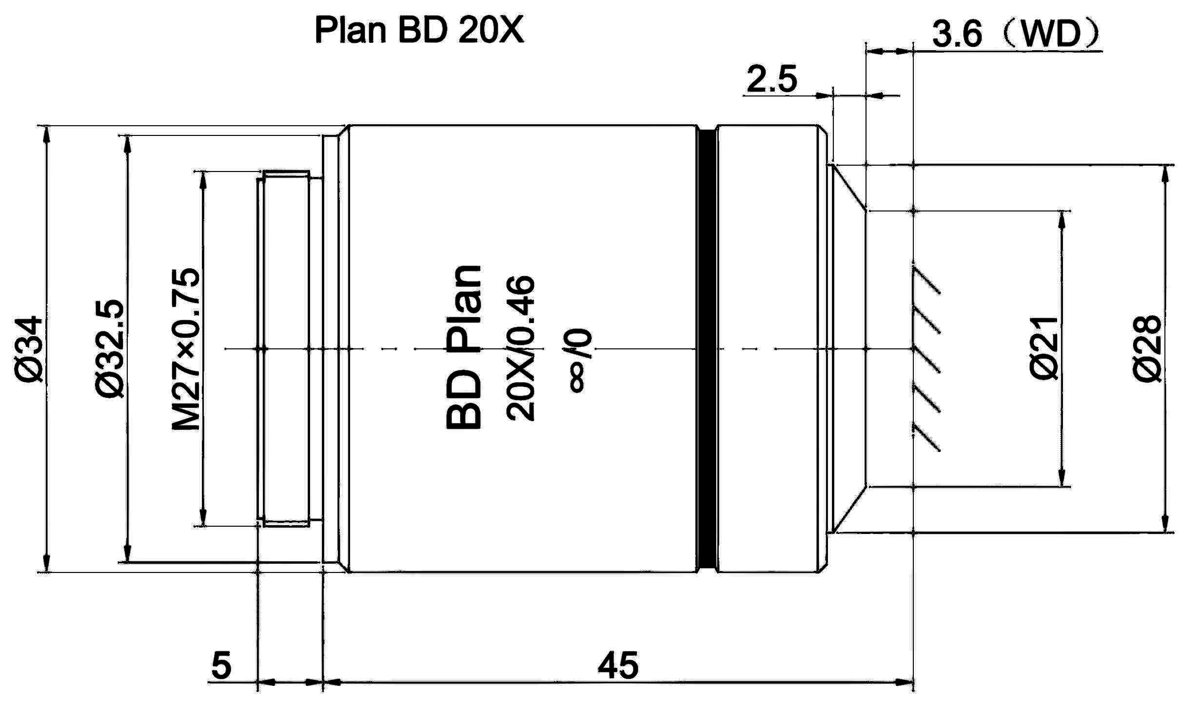 Plan Objective Bright and Dark Field 20X, Optical System Characteristics Infinite Correction, Observation Method Bright Field / Dark Field, Level of Chromatic Aberration Correction Achromatism, Focal Length 10MM, Numerical Aperture 0.46, Working Distance 3.6MM, Field Number of The Objective 25MM, Resolution 0.6um, Depth of Focus 1.3um