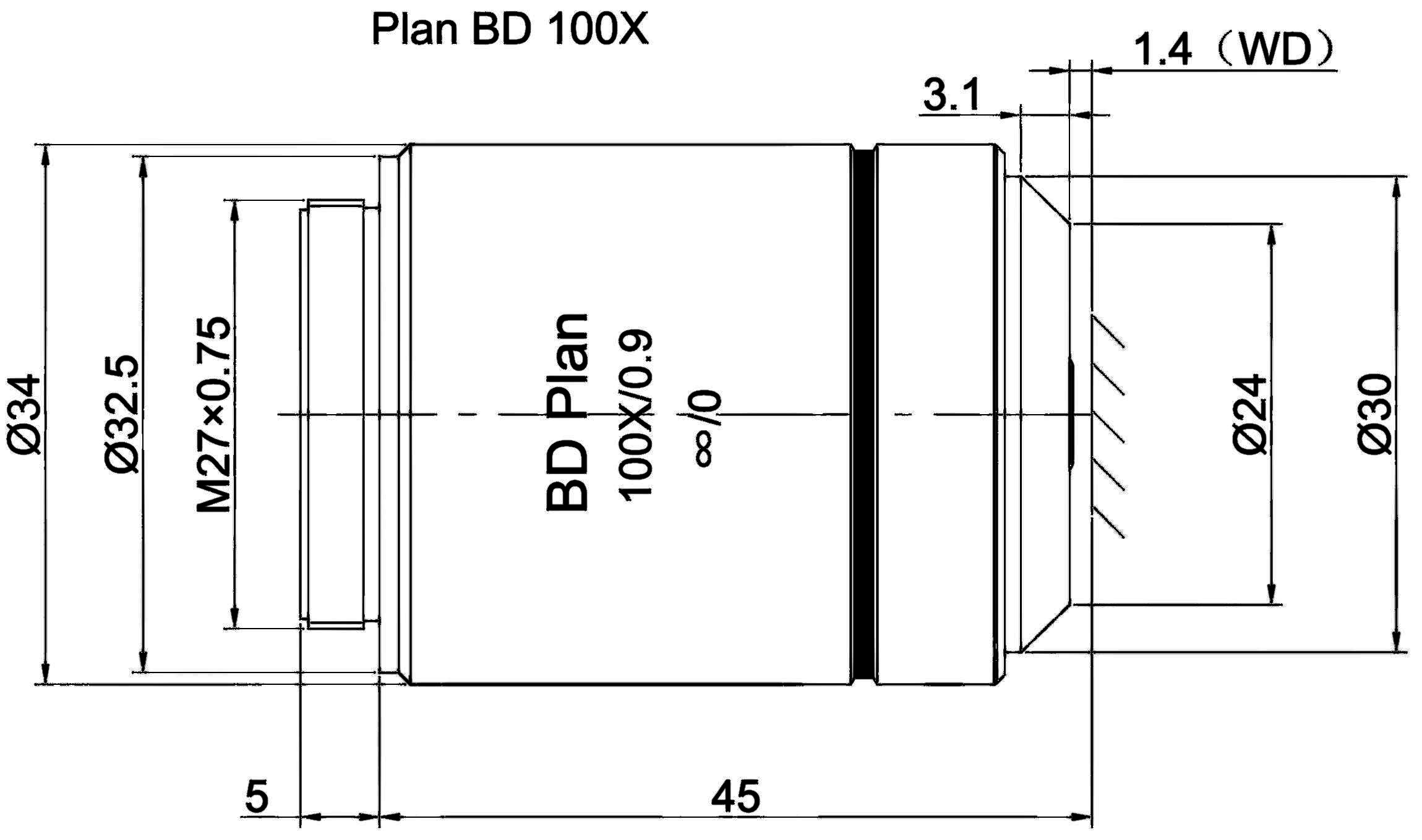 Plan Objective Bright and Dark Field 100X, Optical System Characteristics Infinite Correction, Observation Method Bright Field / Dark Field, Level of Chromatic Aberration Correction Achromatism, Focal Length 2MM, Numerical Aperture 0.9, Working Distance 1.4MM, Field Number of The Objective 25MM, Resolution 0.31um, Depth of Focus 0.34um