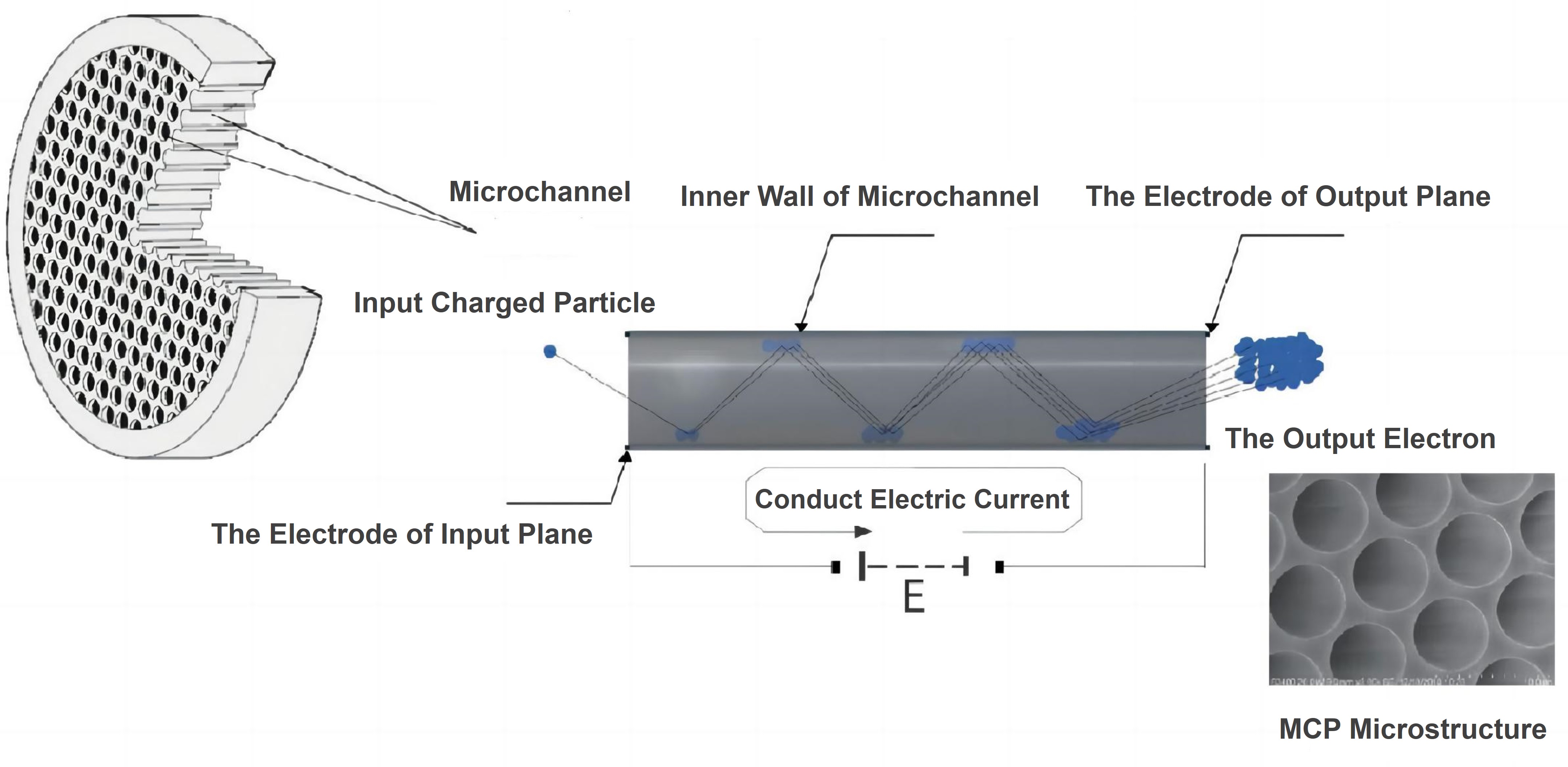 Micro-Channel Plate (MCP), Overall Dia. Φ49.95±0.05mm, Useful Area Φ44mm, Channel Dia. 8±0.5mm, Channel Pitch 10±0.5mm, Bias Angle 6°± 1° , Thickness 0.38±0.02mm, Resistance @500V 40~150MΩ, Gain ≥1000@800V