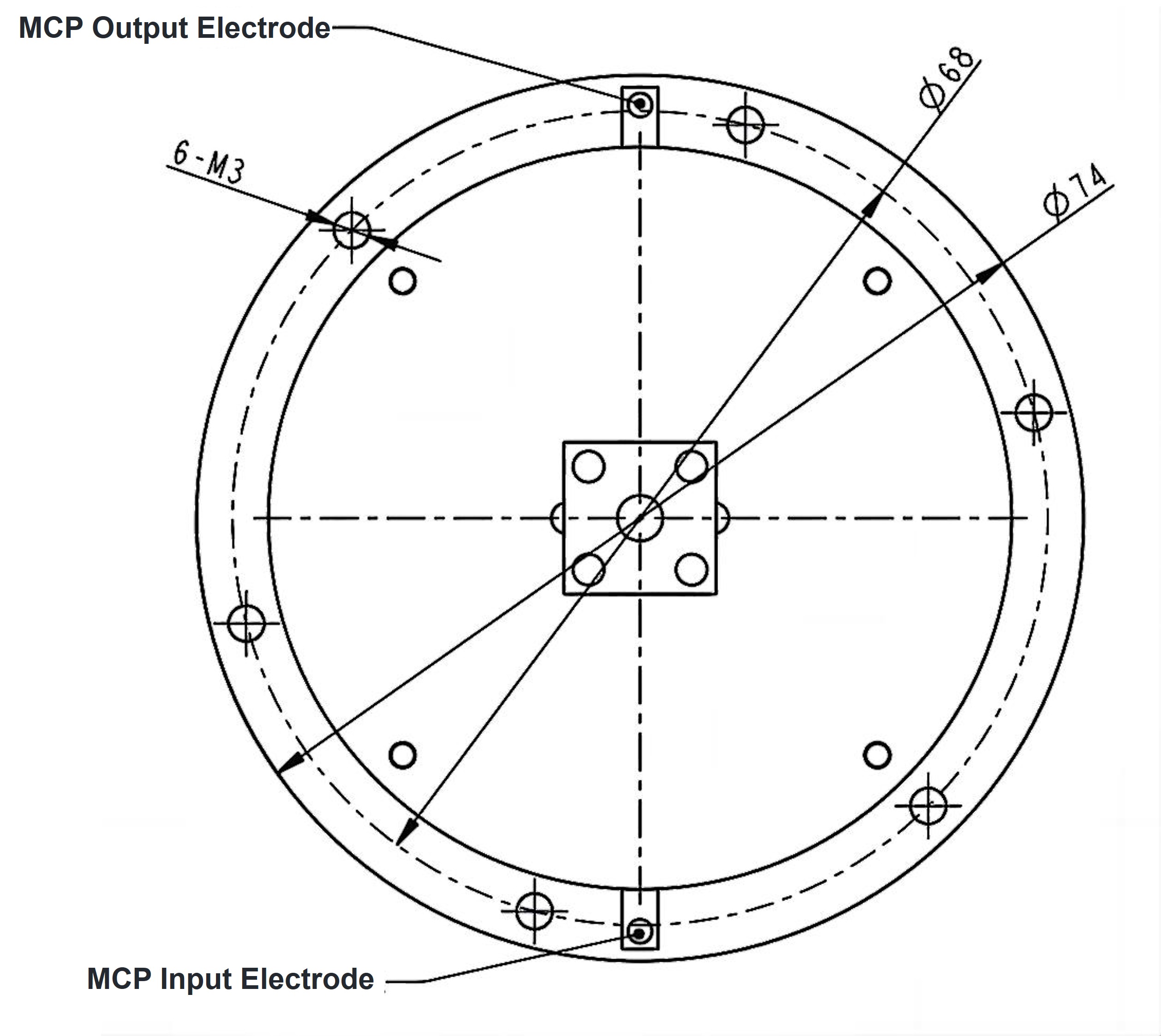 Φ25 Micro-Channel Plate Assembly with Single Anode, Diameter Φ25mm, Channel Diameter 6μm, Effective Area Φ18mm, Resistance 100~240MΩ, Bias Angle 6°, Number 2, Gain ≥1x10^6, Dark Current 50pA@2200V, Voltage 1.8~2.2KV, Vacuum Condition 1×10^-4