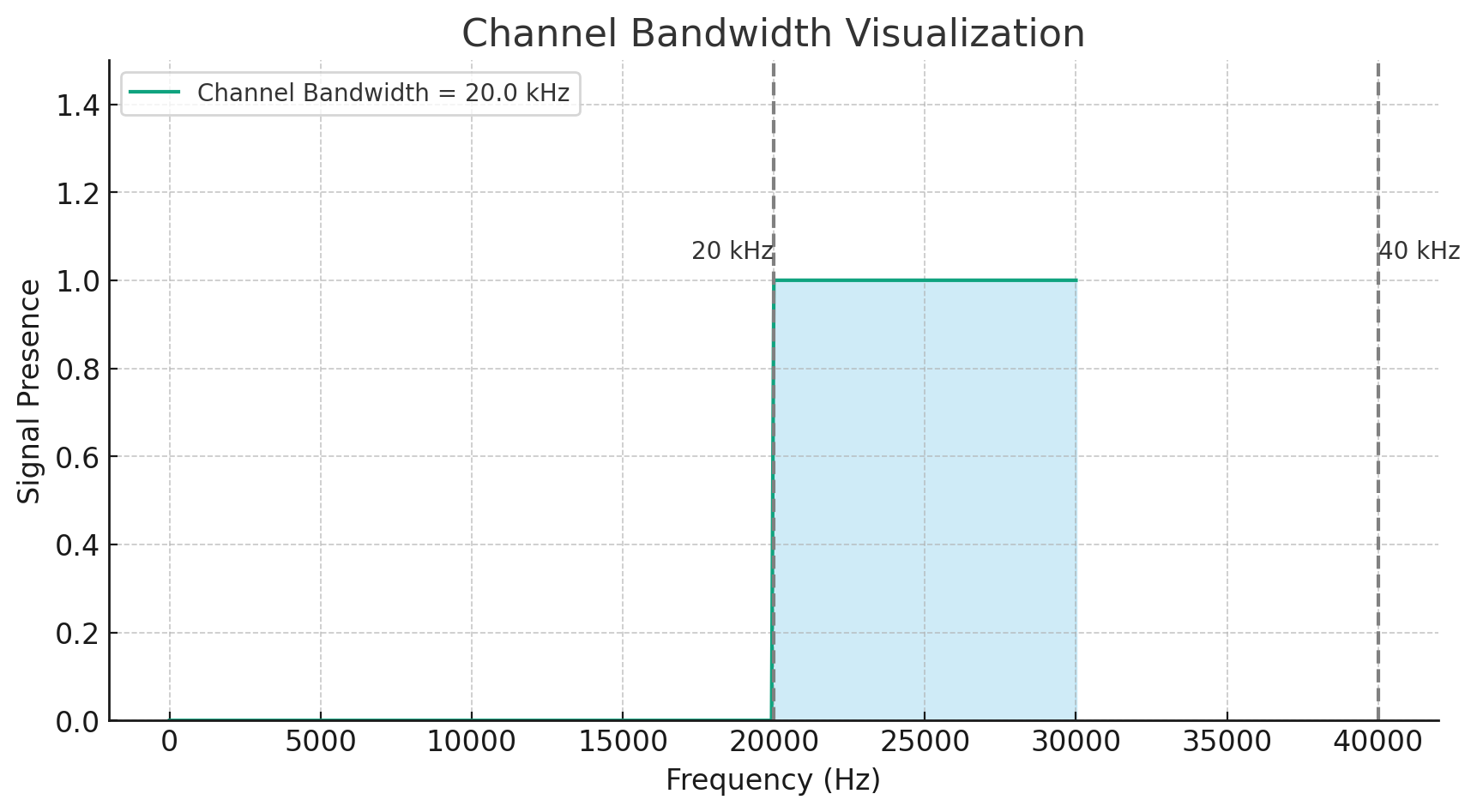 The chart above visualizes the concept of channel bandwidth. In this example:The bandwidth of the channel is represented as the range of frequencies between 20 kHz and 40 kHz, giving a total bandwidth of 20 kHz.The area shaded in light blue indicates the range of frequencies that the channel can carry.The signal presence is indicated by the height of the blue area; it's either present (1) or not present (0), representing a simple on/off signal for illustrative purposes.