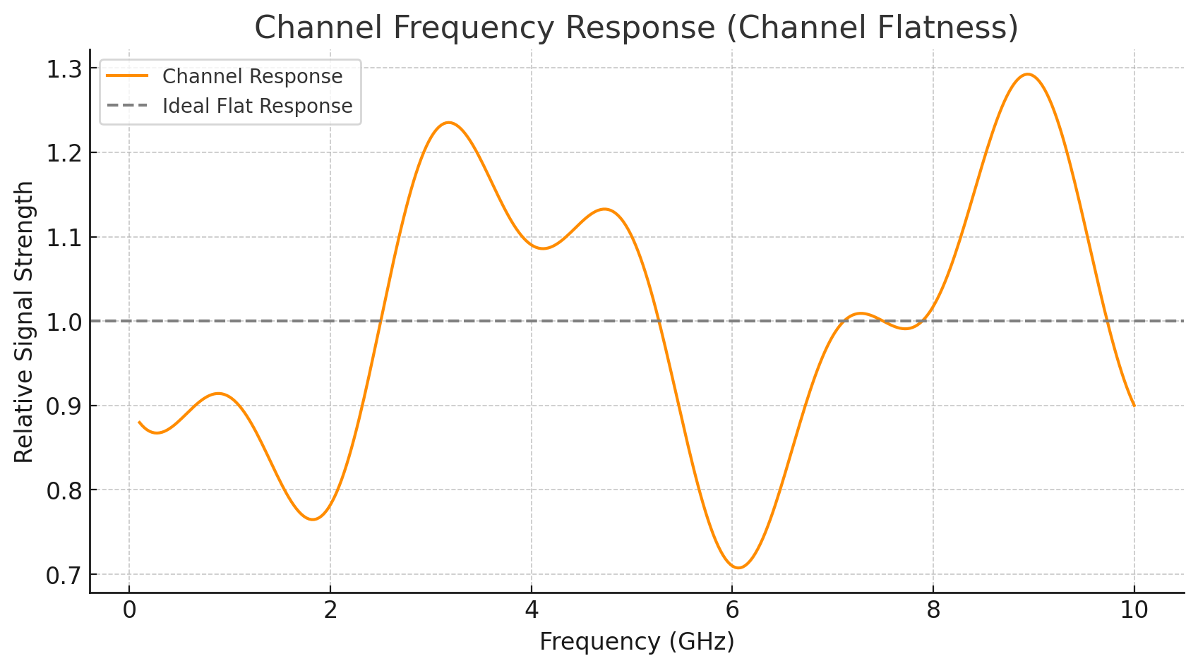 Uniformity of Response: Channel flatness is essentially about how consistently a channel or system transmits signals across its entire frequency range. A perfectly flat channel would transmit all frequencies with equal power, meaning the channel does not preferentially attenuate or amplify any frequency within its operational bandwidth.